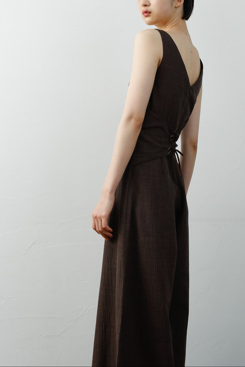 A 90s jumpsuit purchased in France. The linen blend makes it the perfect material for summer. The front is simple, but the lace-up back is very elegant. The design is chic yet effortless. It also looks great with vivid flat sandals.