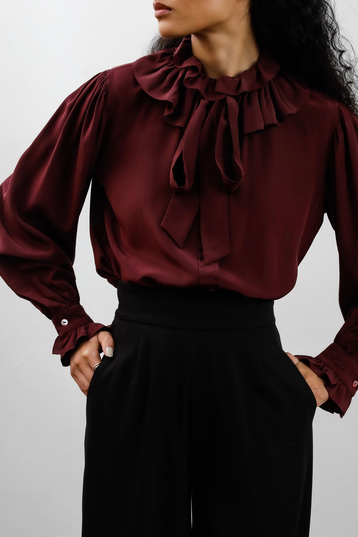 This silk blouse was created by Yves Saint Laurent in 1977. The combination of ruffles and a bowtie is truly elegant.