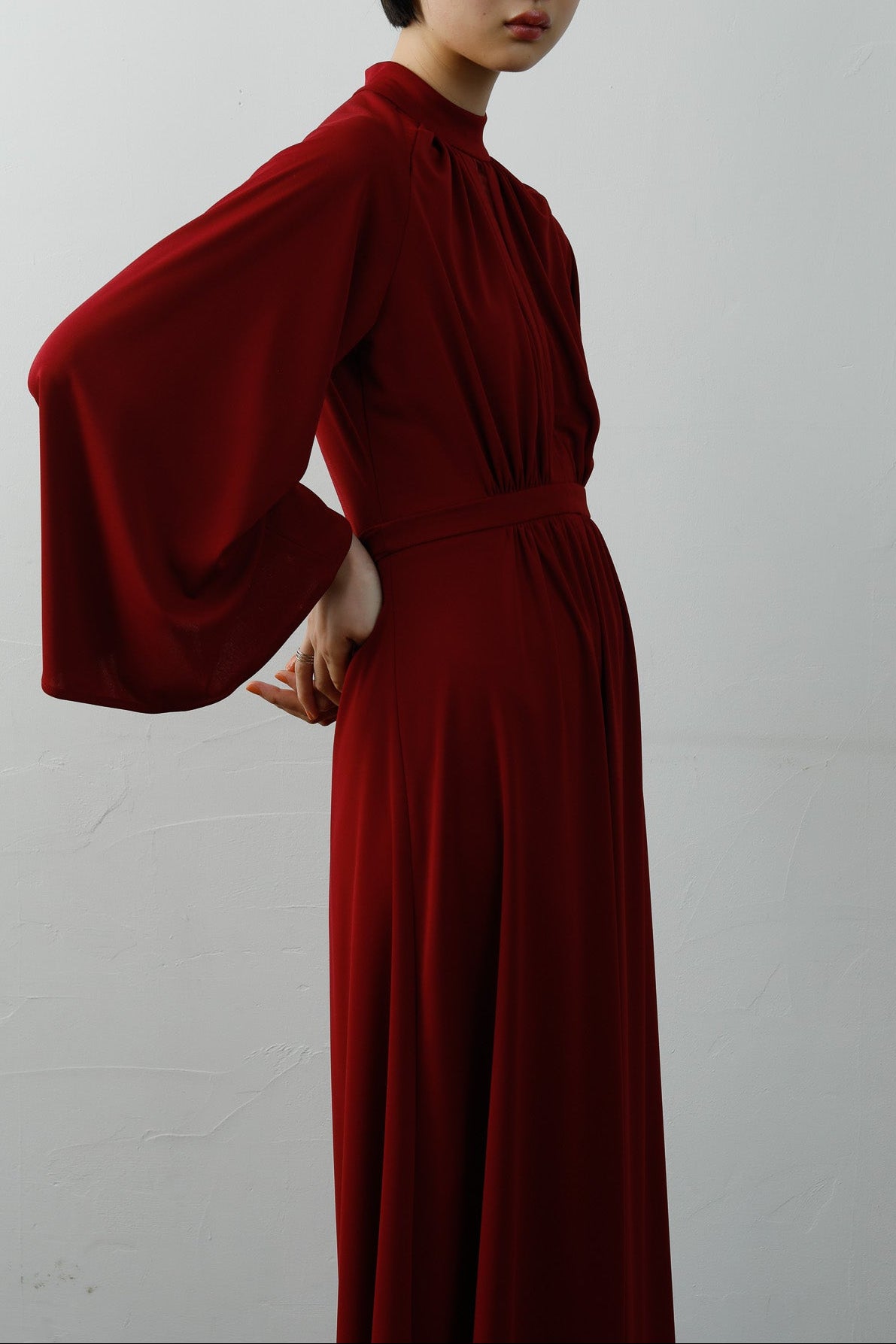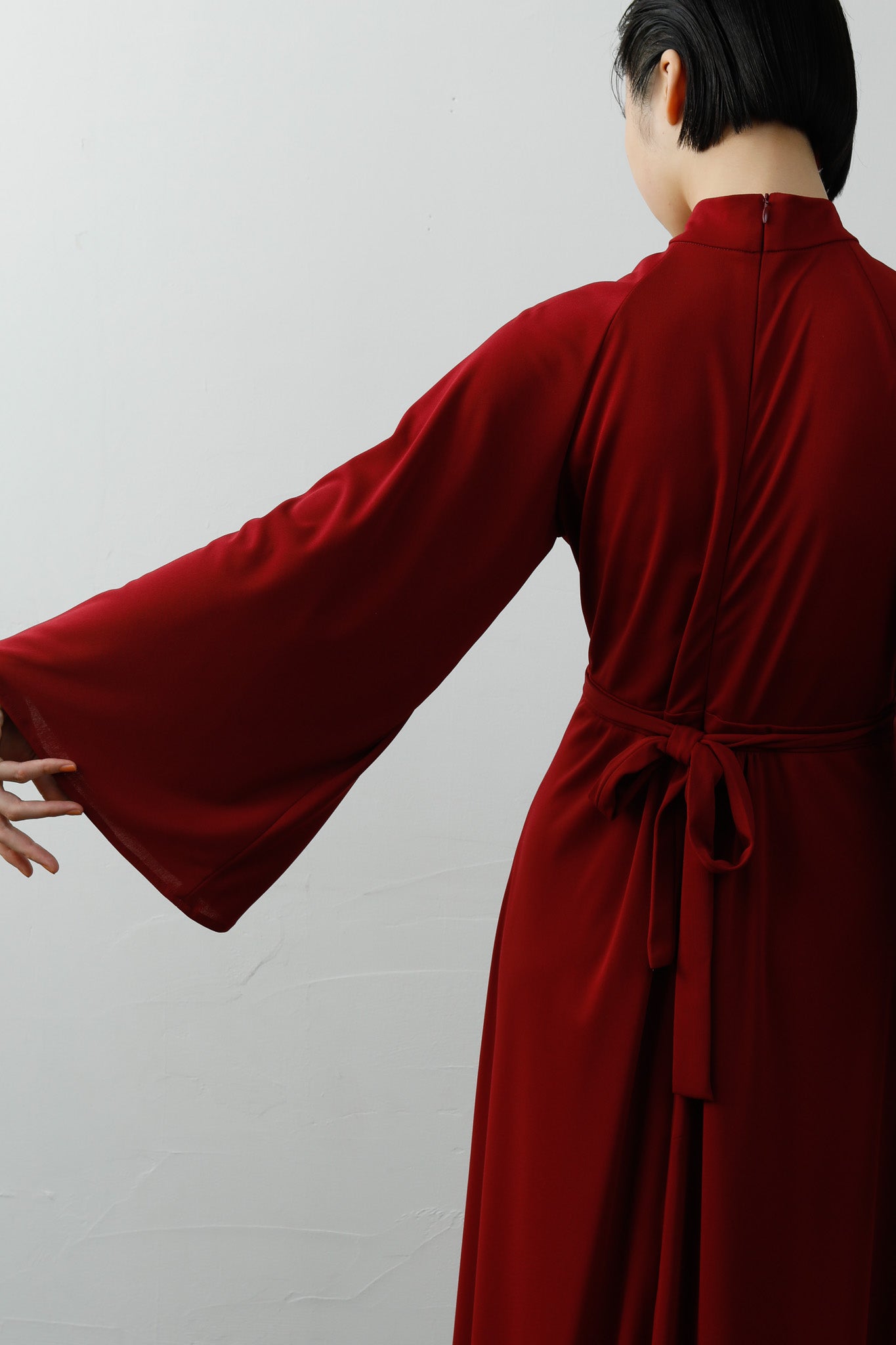 こちらは70年代ロンドンヴィンテージから着想を得たMoujikドレス。ハイネックのデザインでその周りにスリットがさりげなく入っています。深みのあるボルドーカラーはクラシックでエレガントな印象に。(※色違いでブラックもございます。)