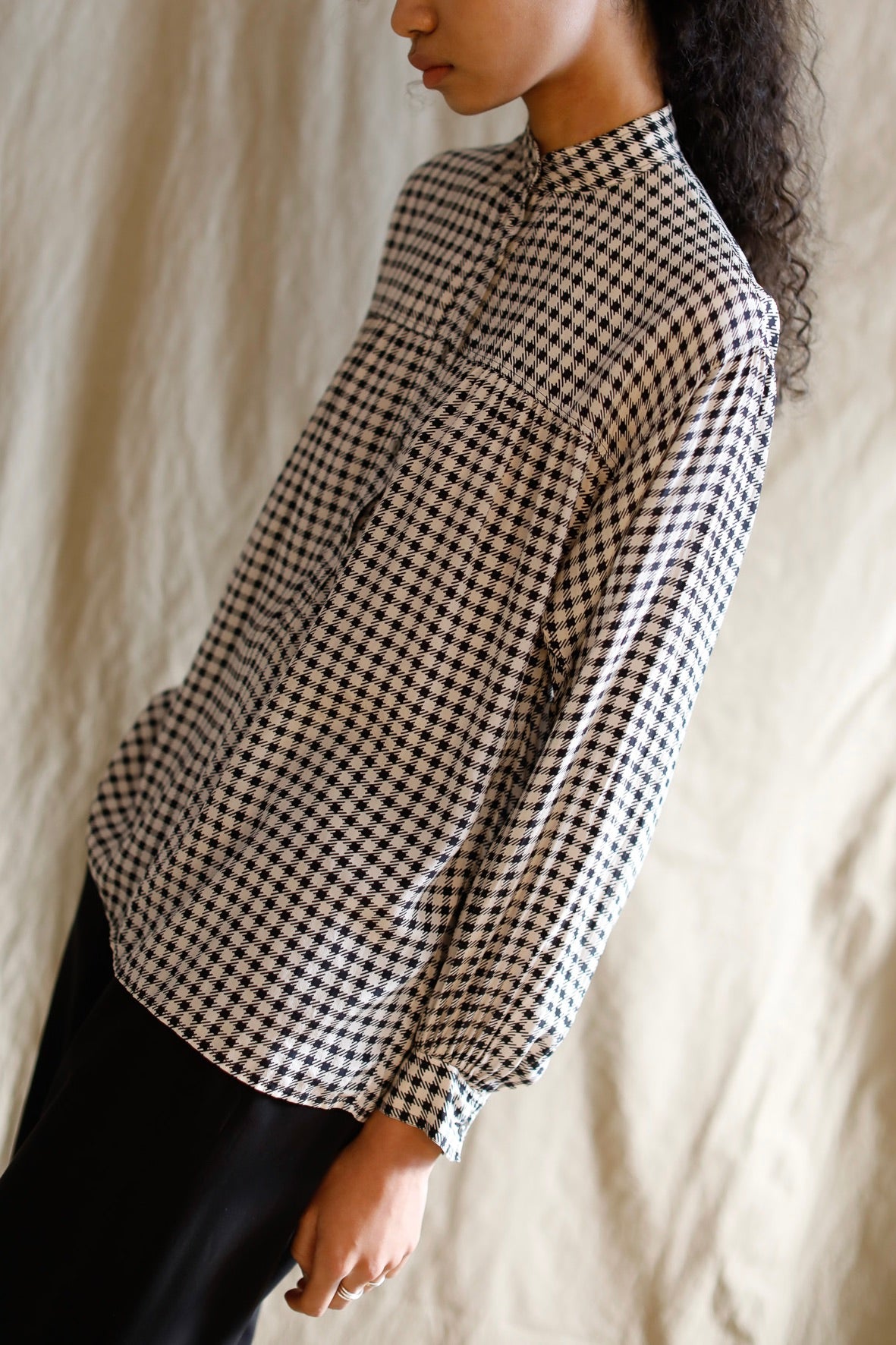 イヴ・サンローランにより1978年に製作されたシルクブラウス。スタンドカラーでプルオーバーなのが珍しいです。